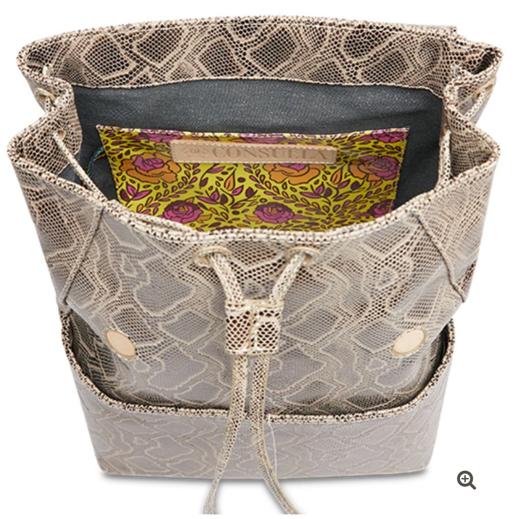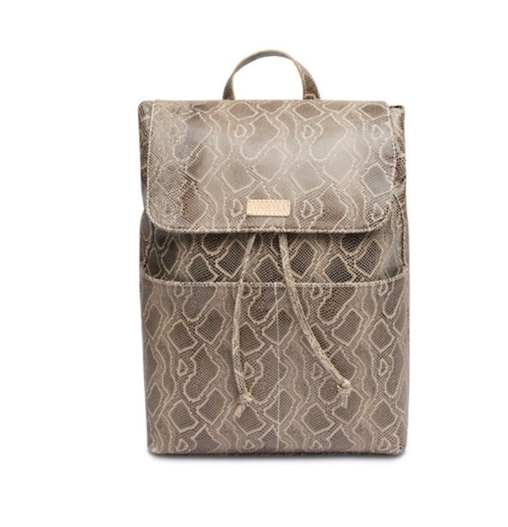 Description: An edgy neutral, this reptilian leather is soft and supple with a relaxed feel. The Consuela Backpack offers such thoughtful details as front slip pockets, interior lanyard, numerous compartments, and adjustable straps to create a go-anywhere bag that is both structured and relaxed.
