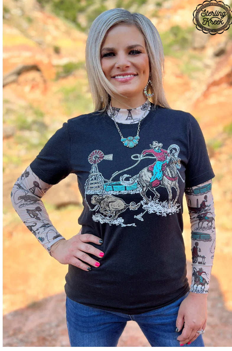 Saddle up and show off your wild side with our God's Country Mesh Top. Cream-colored with a unique design featuring a cowboy roping a calf and a windmill with a water tank. Pops of turquoise and red add a playful touch. Perfect for those looking to add a little country flair to their wardrobe. Yeehaw!