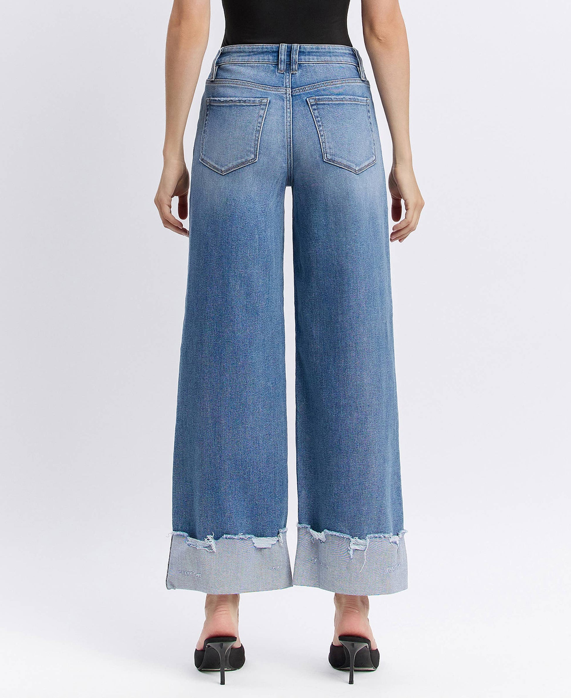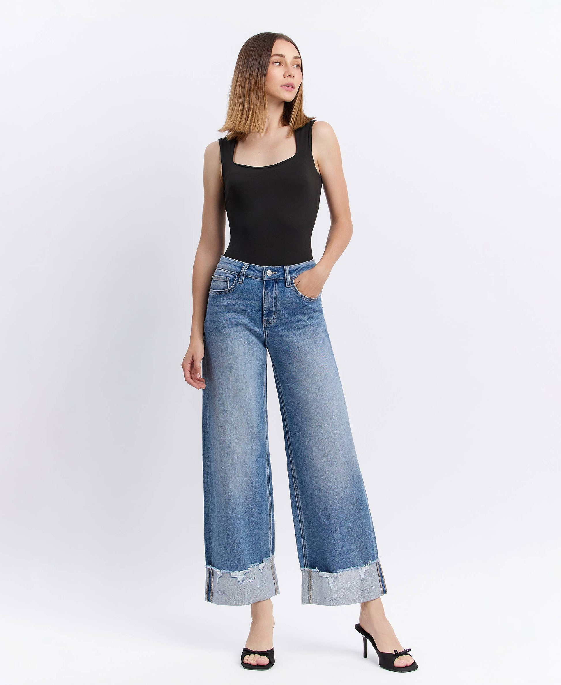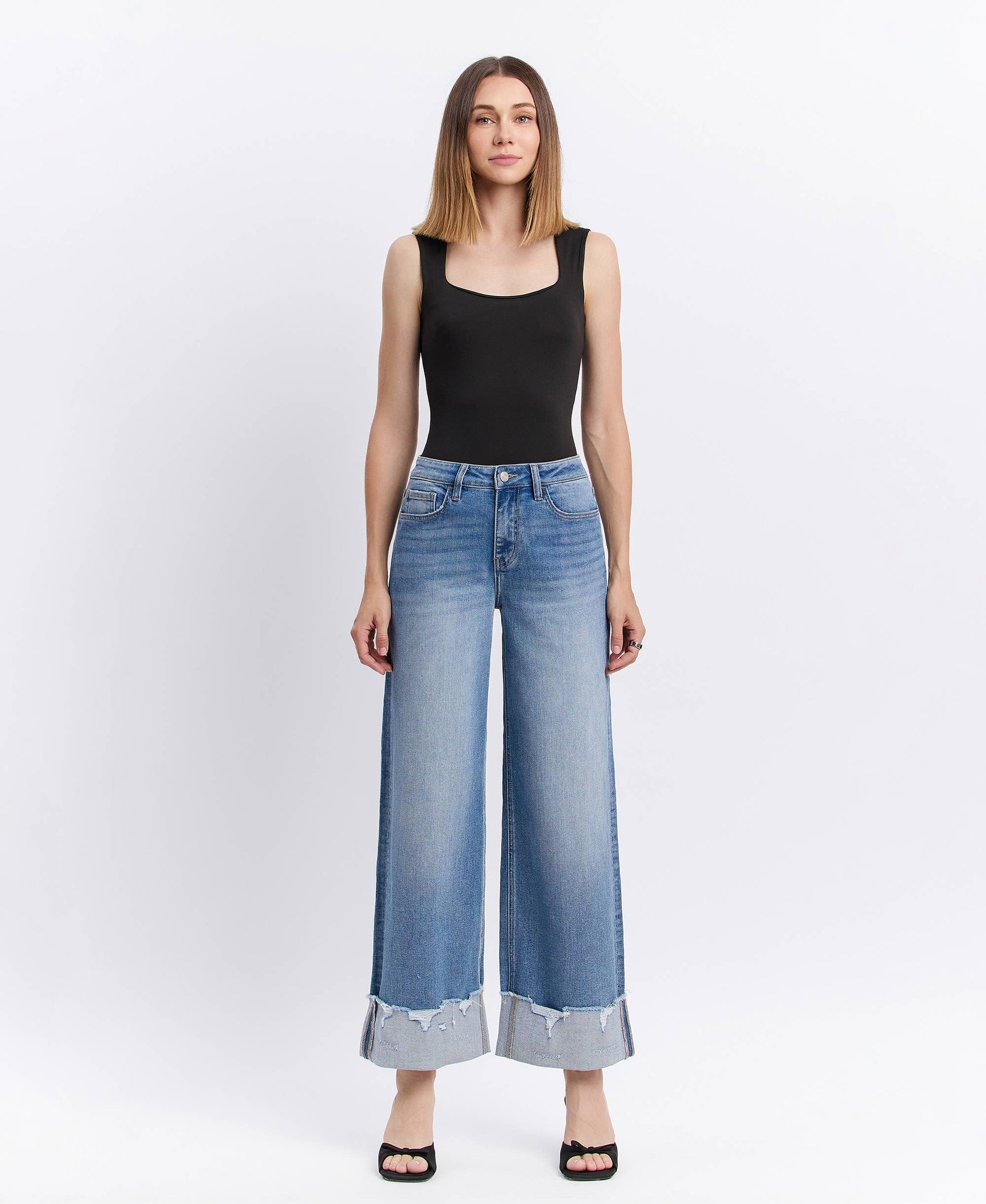 COMFORT STRETCH DENIM, HIGH RISE WAIST, SINGLE CUFF HEM, ANKLE LENGTH, WIDE JEANS