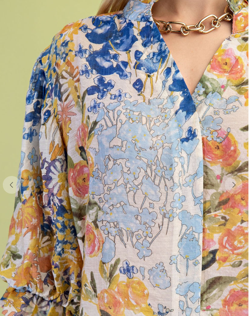 Floral Printed Button Down Top with 3/4 Length Gathered Balloon Sleeves Model is 5'7" wearing a small.