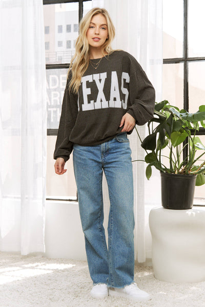 Graphic print "TEXAS" - Soft rib-cord fabric - Loose fit with drop-shoulder design - Bands on sleeves and bottom - Model in heather grey is 5' 8" 32-23-34 and wearing a Small