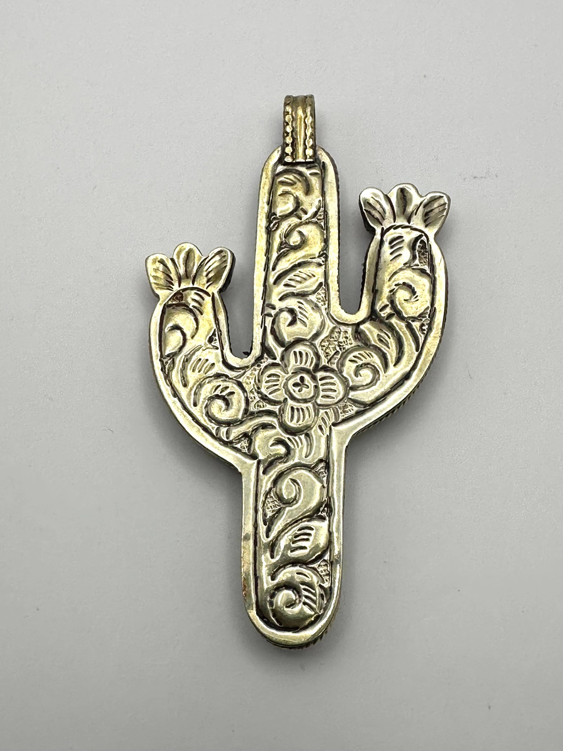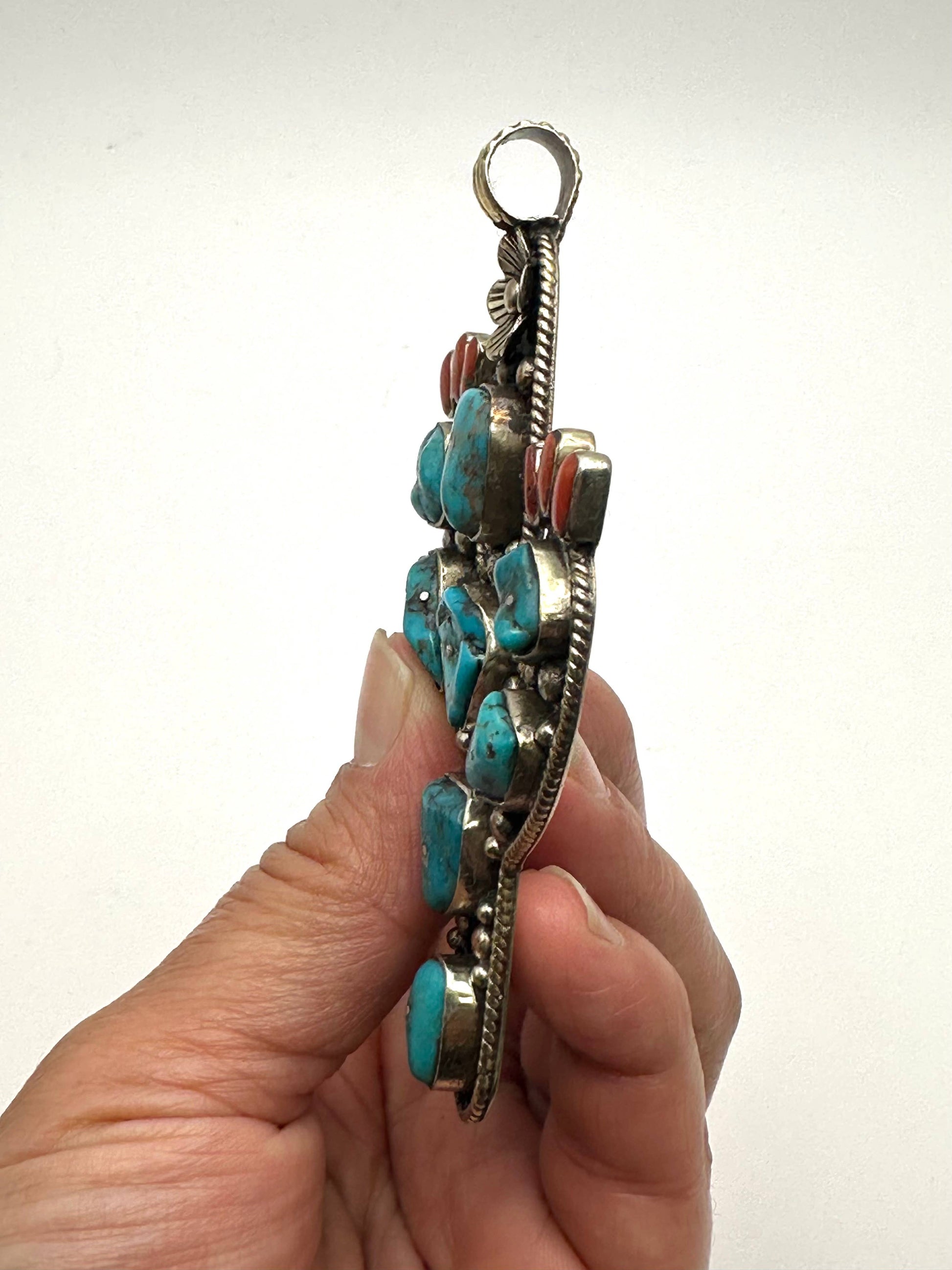 This beautiful cactus pendant was handcrafted in Nepal. It is set with coral and turquoise in white metal.