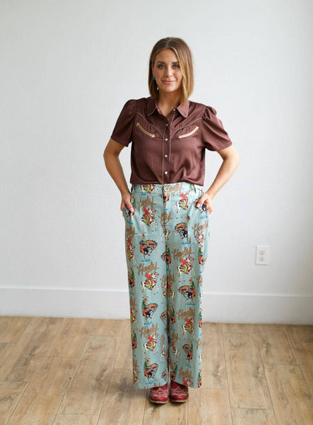 Features: These wide-leg statement pants feature an allover Western-themed novelty print on a teal background, including rodeo cowboys, broncos, and “Howdy” text illustrations in vibrant colors. Designed with a high-rise waist and full-length leg, the pants offer a relaxed silhouette perfect for standout seasonal styling. A front zipper with button closure ensures secure wear, while side pockets add functional convenience. Key Features: • Style: Wide-leg novelty print pant • Color: Teal with multicolor Western “Howdy” print • Waist: High-rise with front zip and button closure • Pockets: Side seam pockets • Fit: Relaxed through hip and leg • Length: Full • Fabric: Lightweight woven (material content TBD—please confirm cotton, polyester, or satin blend) • Suggested Use: Boutique western, rodeo season, or festival assortments