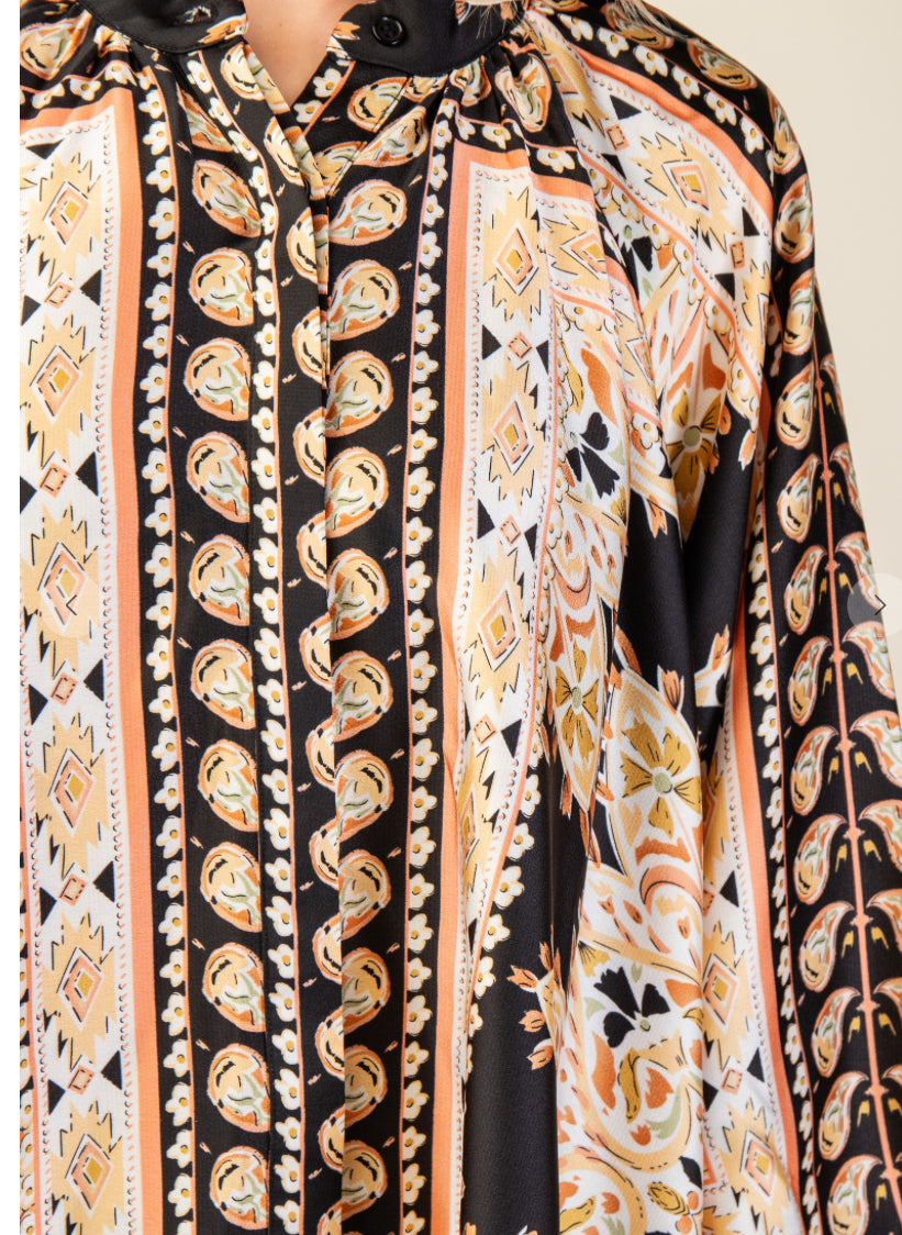 Mirrored Scarf Print Blouse with Covered Button Placket Model is 5'7" wearing a small.