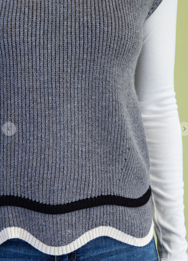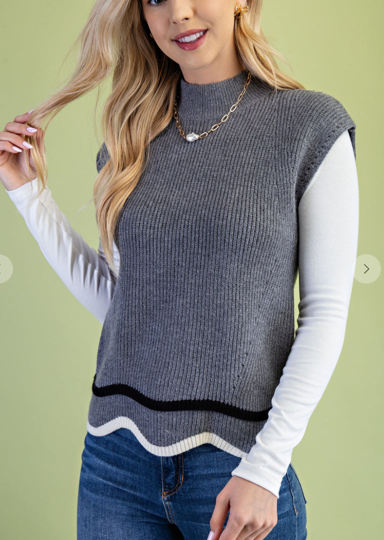 Mock Neck Knit Sweater Vest with Contrasting Boarder Details and a Wavy Hem Model is 5'7" wearing a small.