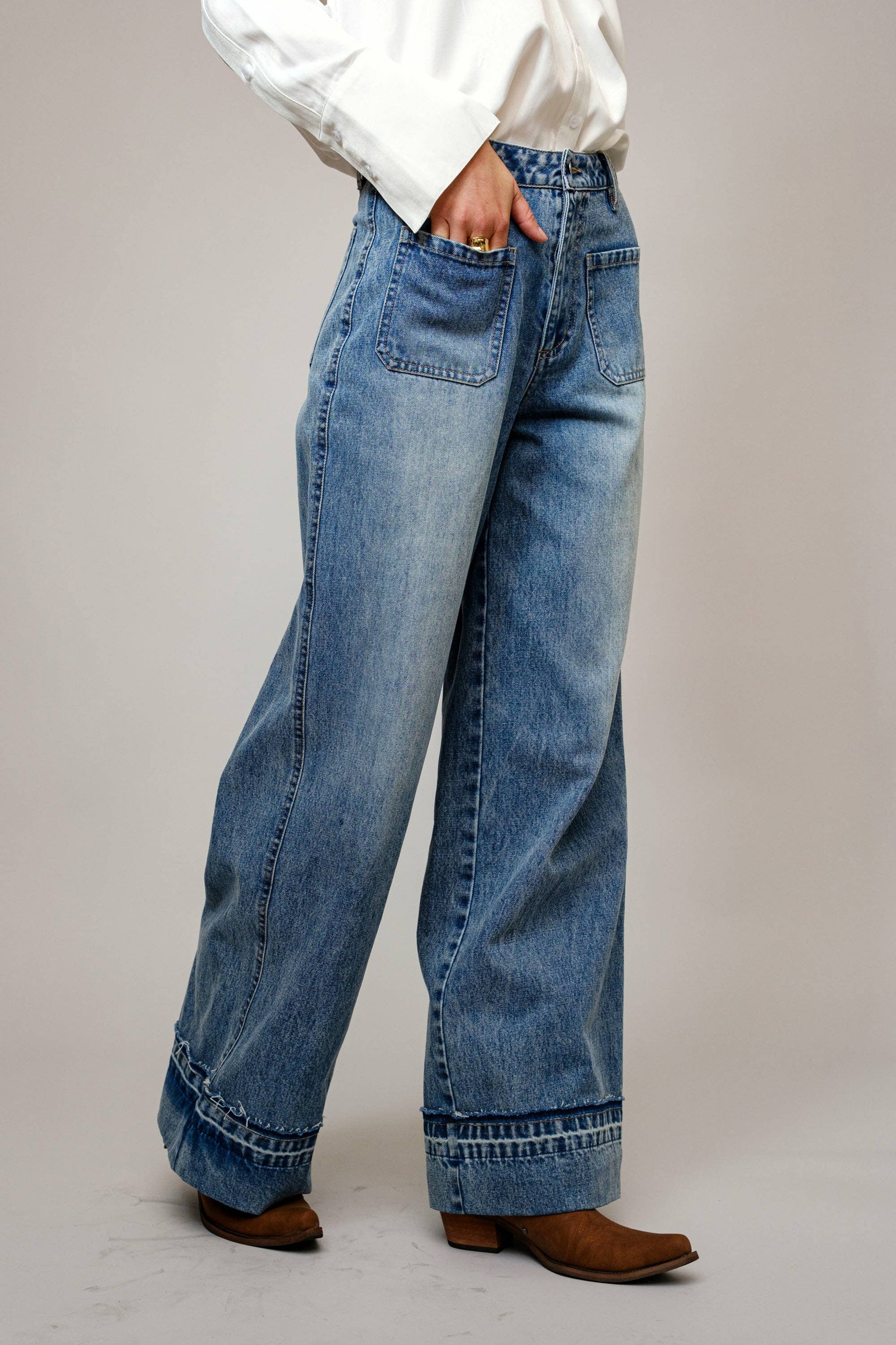 Mid-rise denim jeans with a straight-leg fit, front patch pockets, and a unique folded cuffed hem. Crafted from durable fabric with a classic medium wash for a vintage western-inspired look.