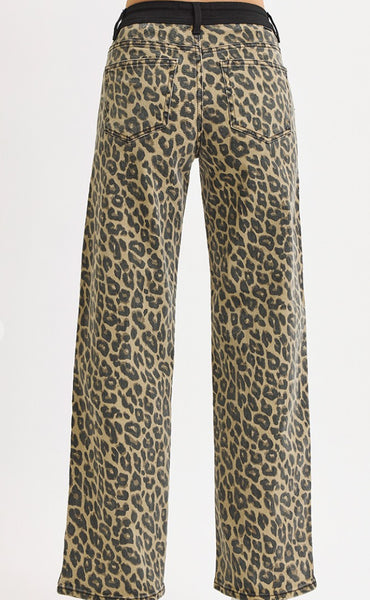 HIGH RISE WIDE LEG LEOPARD PRINTED CONTRAST WB DETAIL PANTS - Rise 10 1/4" | Inseam 31" in size 3/26