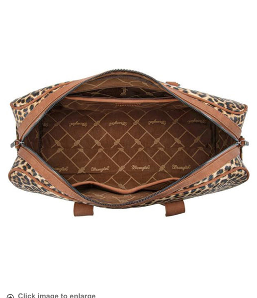 Wrangler Whipstitch Collection Duffle Bag18" x 8" x 12" (Drop 5'')Whipstitch detailWrangler logoTop zipper closureInside of bag include a zippered pocket and 2 open pocketA zippered pocket on the back/ back pocket sleeve slides over rolling luggage handles.Double round handleDetachable and adjustable crossbody strap
