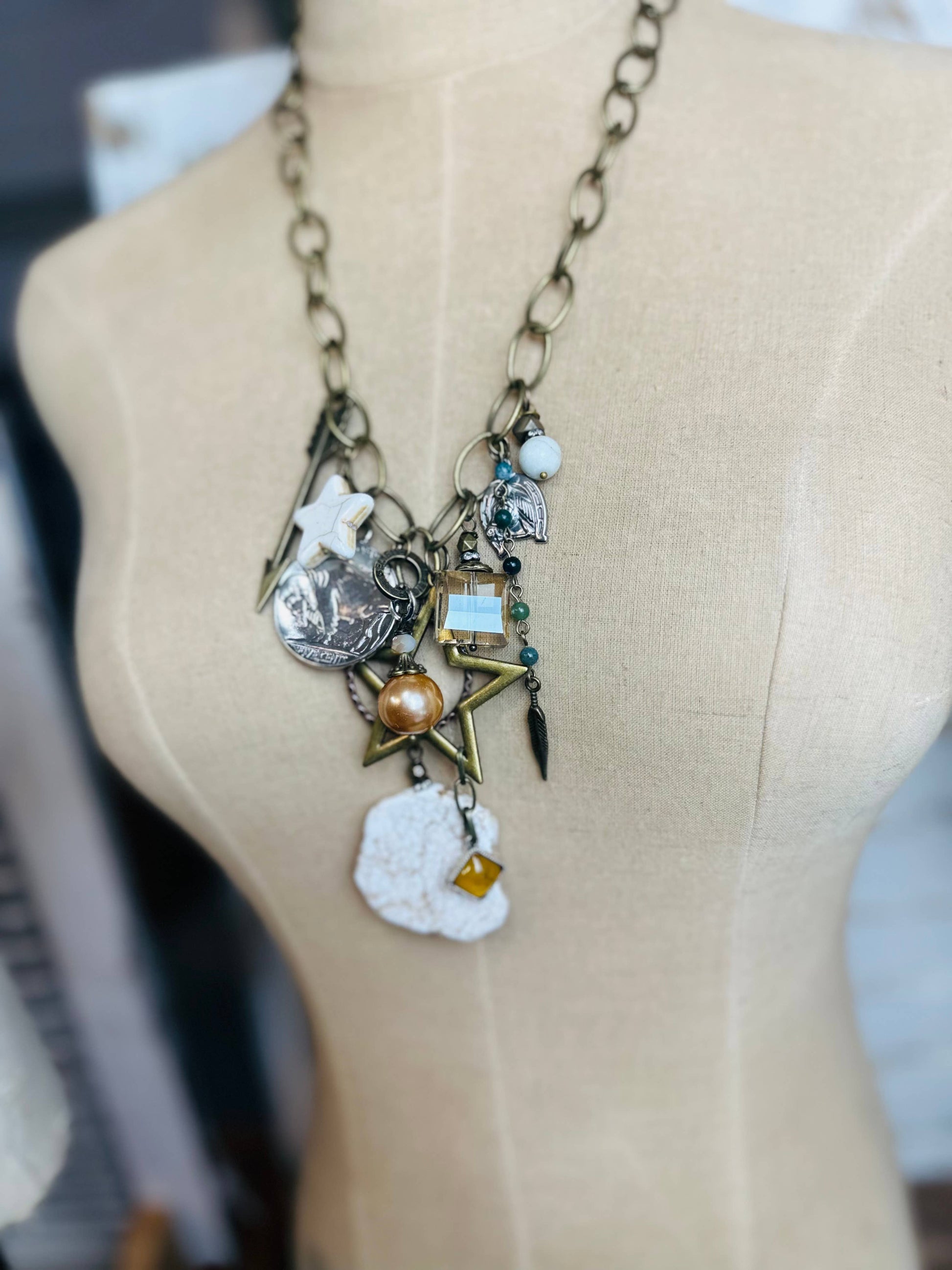 - Dutton - 24” Length Necklace This group is so cool and current with the buffalo nickel, and all the natural charms the beaded charms are handmade and has a story to tell. The pearls howlite star and large crystal. These necklaces are unique and full of personality. It is like hidden treasures that you wear. Each one is unique to your personality or how you want to express yourself for the day. Never wear dull jewelry. You will be stopped and asked about this wearable piece of art.
