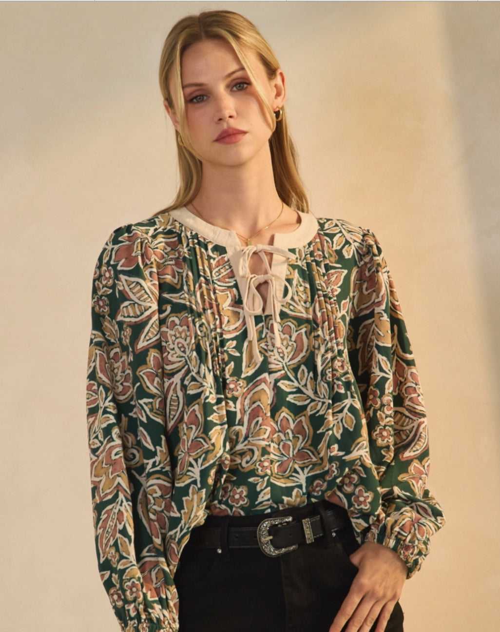 Floral printed blouse with contrast band neckline, front tie, and 3/4 puff sleeves. Total Length: 24" Content: 100% Polyester