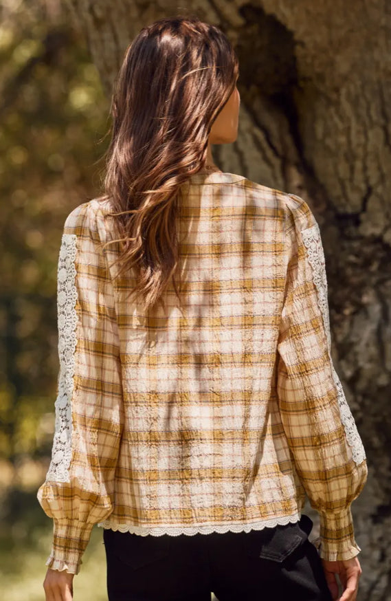 Lace and plaid combo long sleeve blouse. Also available in sizes 1XL to 3XL: Style no. IT18165P. Total Length:23 1/2" Self: 100% Cotton, Cont: 100% Polyester