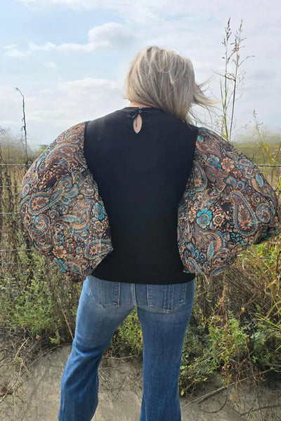 Elevate your style with the Paisley Dreams Top, featuring a sleek black fitted silhouette enhanced by voluminous bubble mesh sleeves. The sleeves showcase a subtle paisley pattern in neutral tones, adding a touch of elegance and intrigue. This top effortlessly combines comfort with standout design, perfect for making a sophisticated statement at any occasion.