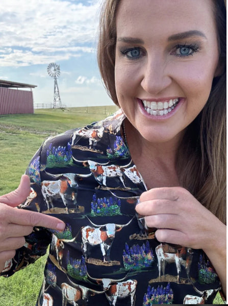 Embrace Texas spirit with the Heart Of Texas Top, featuring stylish quarter sleeves and an eye-catching design of long horns and blue bonnets. This unique combination brings a bold, rustic charm to your wardrobe, perfect for standing out on any occasion. Comfortable and distinctive, it celebrates your love for Texas heritage in a modern, wearable way.