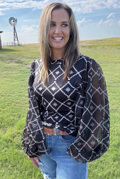 Elevate your style with The Way It Is Top, featuring a dynamic black and white Aztec pattern that adds bold, graphic appeal. The bubble sleeve design offers a trendy silhouette that balances volume with sophistication, perfect for making a statement anywhere. Lightweight and comfortable, this top effortlessly combines eye-catching style with easy wearability to enhance your everyday wardrobe.