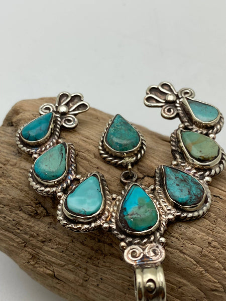 This beautiful squash blossom pendant is set in white metal with natural turquoise. The naturalness of each stone in the pendant will vary in color of the stone. It is handcrafted in Nepal.