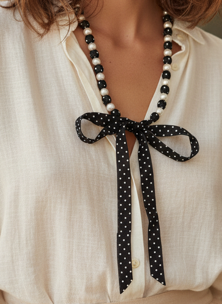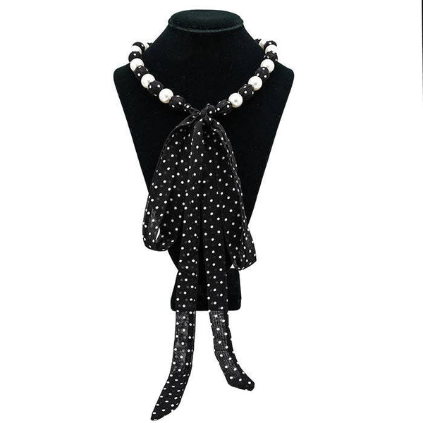 This scarf necklace merges classic charm with modern versatility. It features alternating large faux pearl and black fabric-covered beads, strung on a black chiffon scarf adorned with white polka dots. The extended scarf ends tie into a bow at the front, creating a customizable fit and a bold statement look. Ideal for boutique accessorizing, this piece offers a lightweight, non-metal alternative to traditional necklaces.