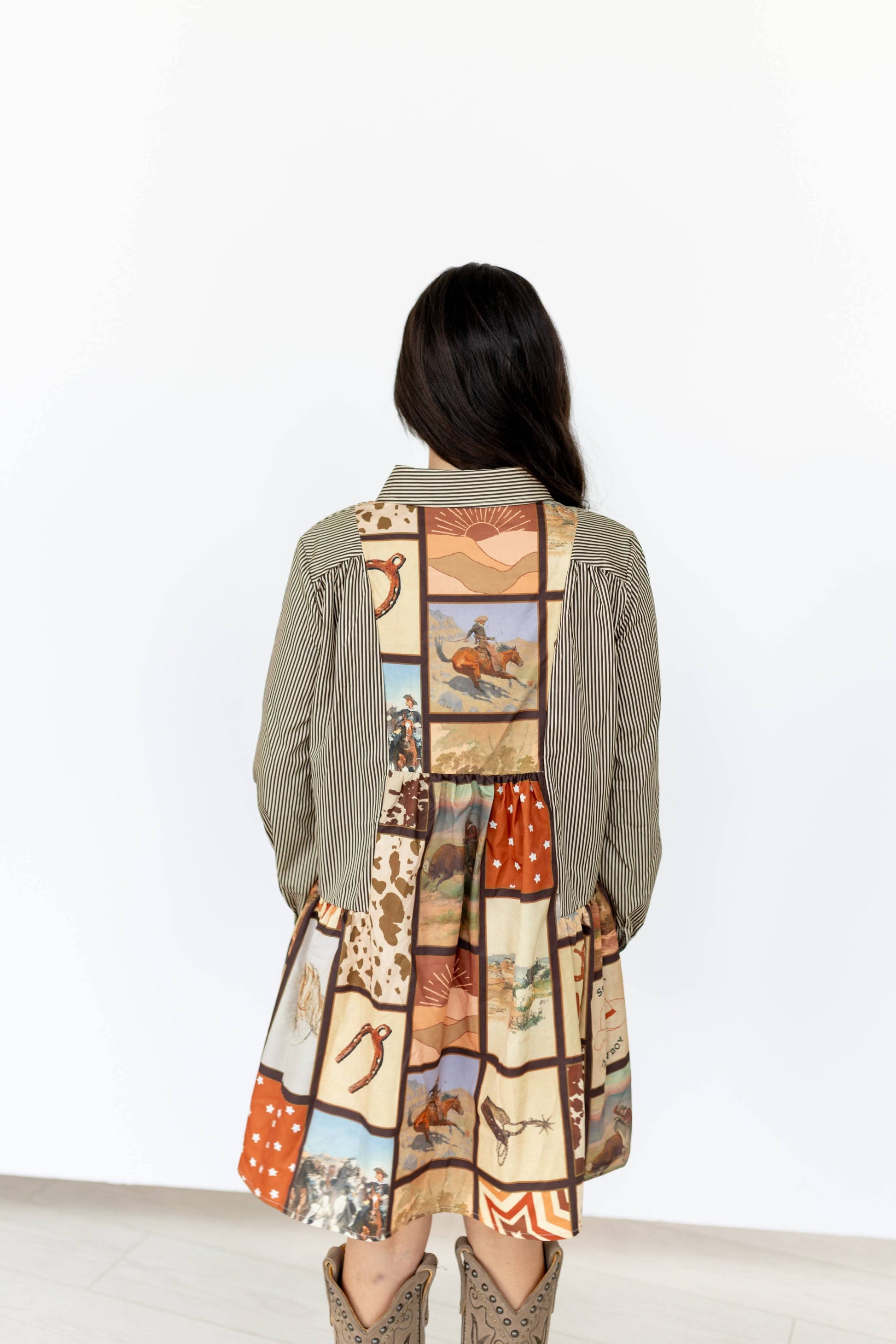 This long sleeve shirt dress features a distinctive western-inspired patchwork design combined with classic pinstripes. The upper portion and sleeves are constructed from a brown and cream vertical stripe fabric, while the lower panel showcases mixed printed square patches with cowboy-themed imagery, stars, and rope graphics. It includes a full button-down front, structured collar, and pleated seam below the bust for added volume and movement. Ideal as a statement piece for western or vintage-themed boutique collections. Specifications: * Color: Brown/cream with multicolor western-themed patchwork * Closure: Button-down front * Sleeves: Long sleeves with button cuffs * Fit: Relaxed, A-line silhouette * Design Details: Mixed fabric construction with pleated drop waist and novelty prints