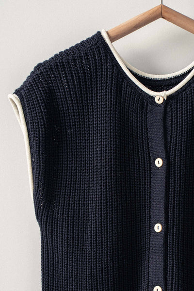 A contemporary sleeveless sweater vest with a distinctive button-back design, perfect for versatile layering and elevated casual style. The soft cotton-blend knit and contrast ribbed trim add a modern touch to this unique piece. Features 52% Cotton, 42% Acrylic, 6% Polyester • Soft, breathable cotton-blend knit • Contrast ribbed trim for added structure • Full button closure along the back • Fit Relaxed, slightly boxy silhouette designed for easy layering and movement